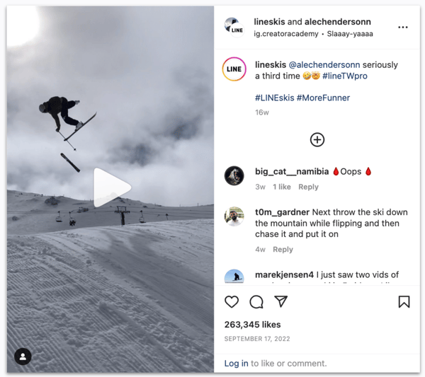 High competitor focus on Instagram was driven by LINE Skis, who generated 9M views and 685K engagements from September to November 2022. Their top video was a co-post with @alechendersonn that garnered 3.7M views and 256K engagements.