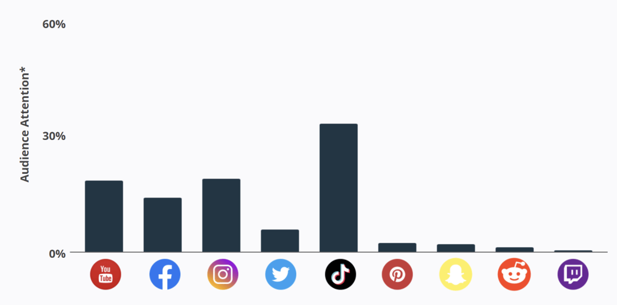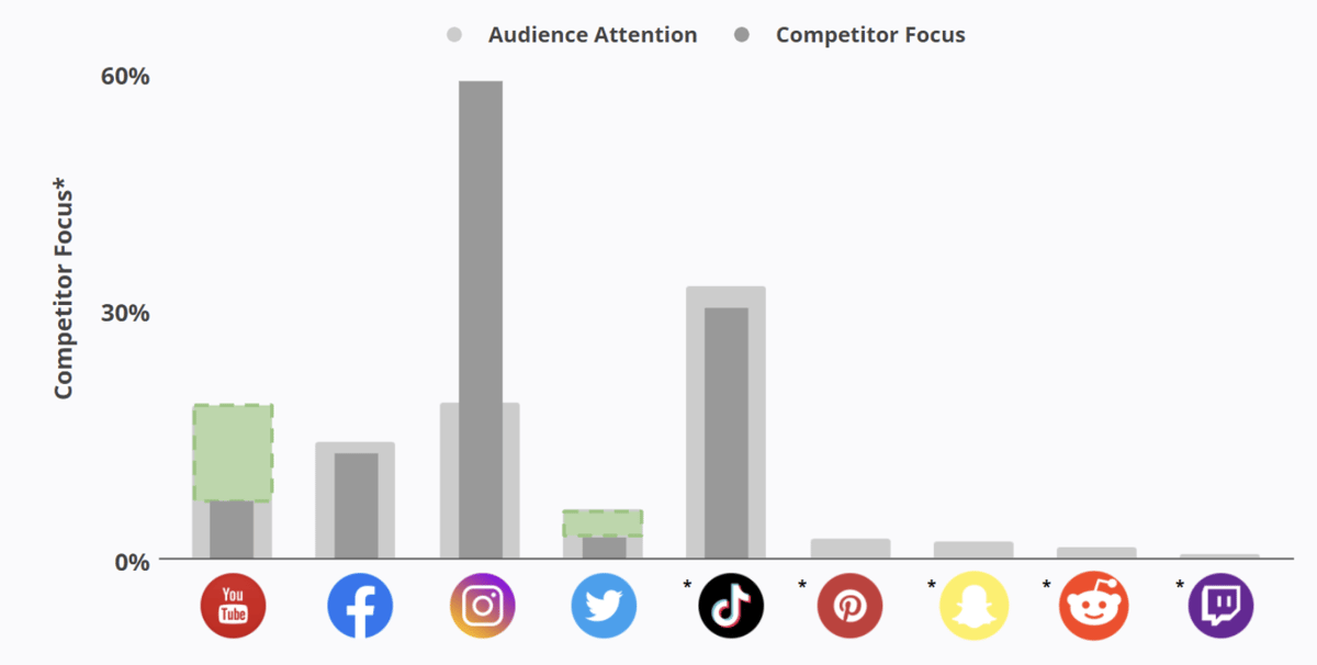 There is whitespace opportunity on YouTube, and Twitter where there is high Audience Attention and low Competitor Focus.